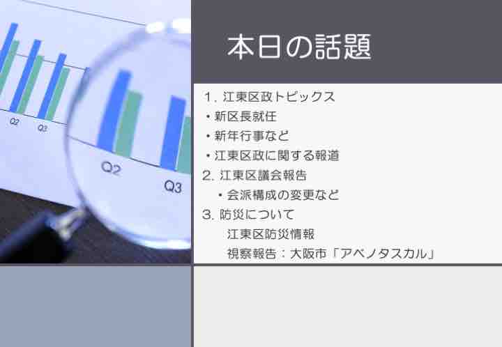 区政報告・議会報告・防災についてをテーマにご報告。