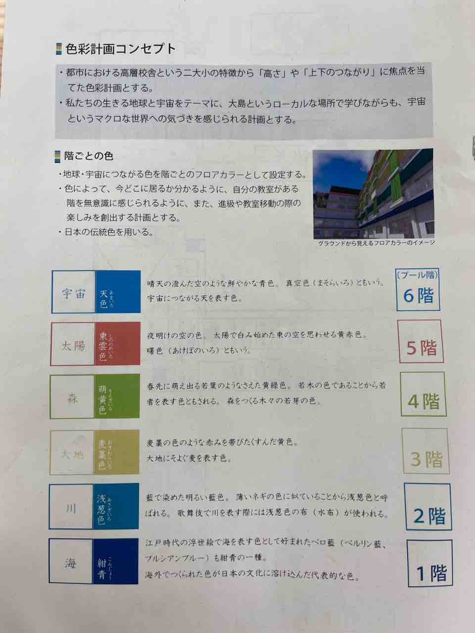 都市における高層校舎という二大小の特徴から「高さ」や「上下のつながり」に焦点を当てた色彩計画が設定されており、各フロアごとにテーマカラーがあります。